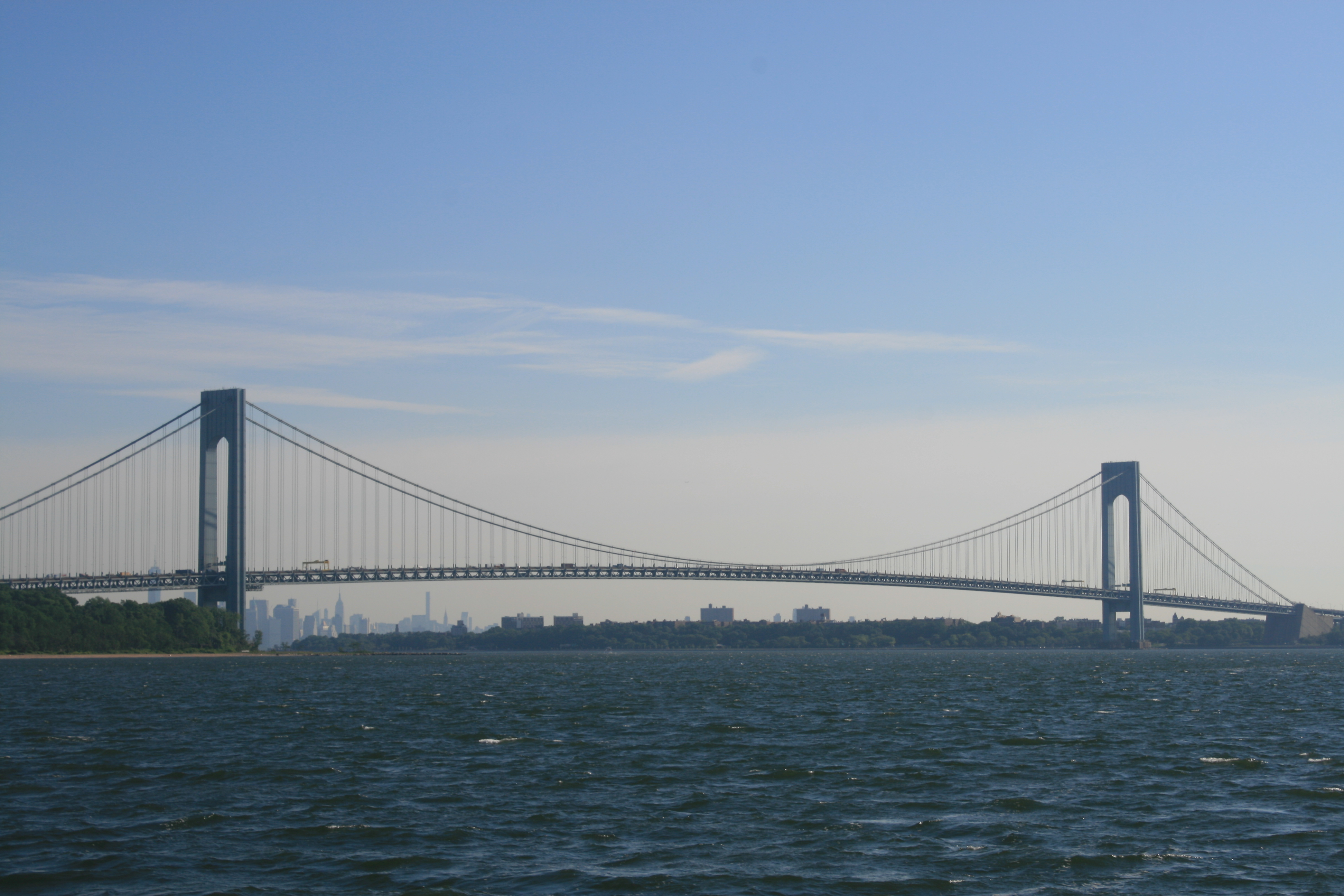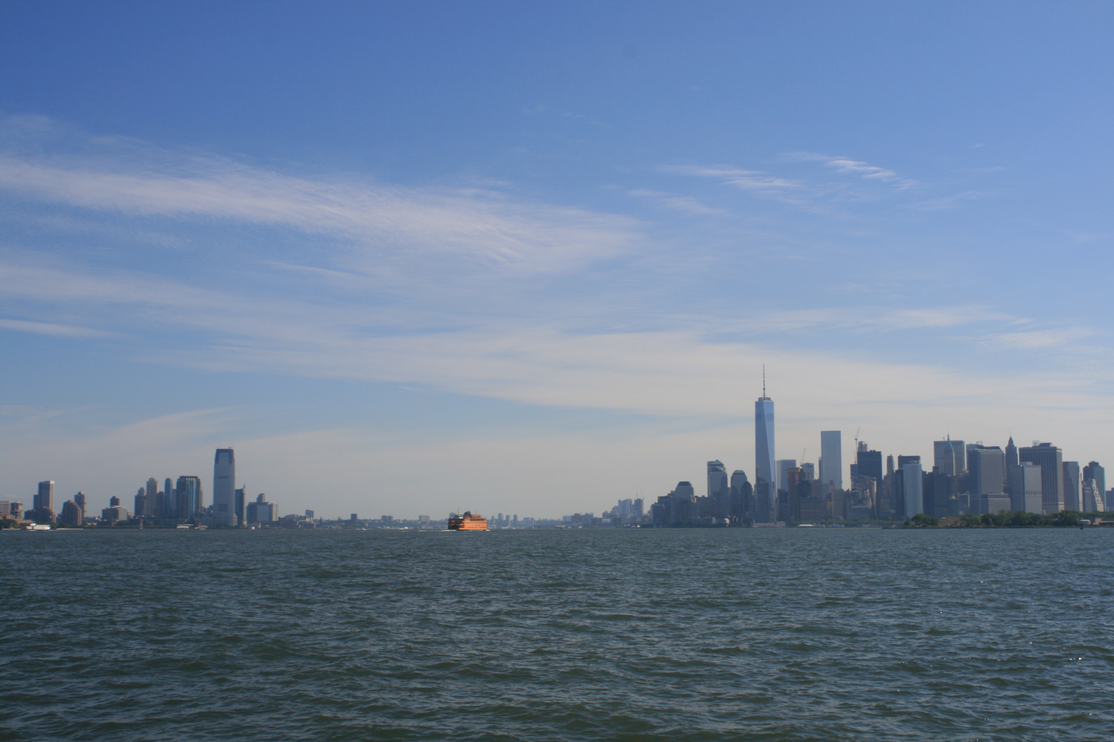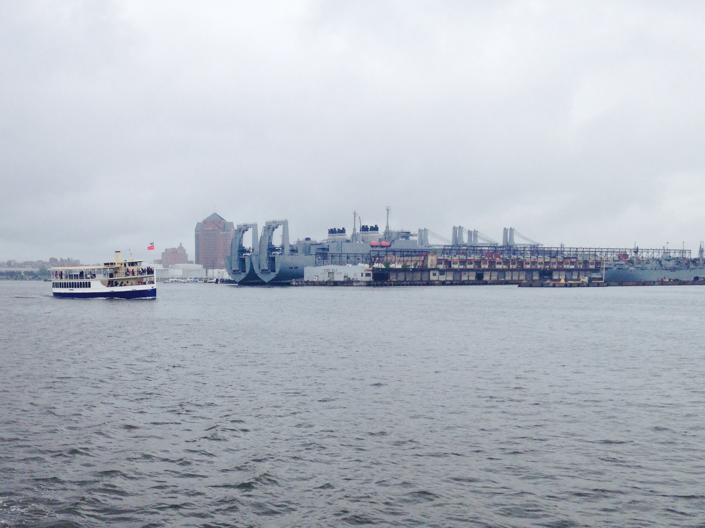 We weren’t sure whether the weather forecast had been wrong, or it was the local effects of the tides, the wakes caused by the many large and small ferry boats, and the wind funnelling round the tall buildings. But I had gone down from the bridge to take photographs from the foredeck, and found myself trapped there, hanging on to the anchor post, unable to get back up to the bridge, while Carina pitched and tossed her way past Battery Park.
