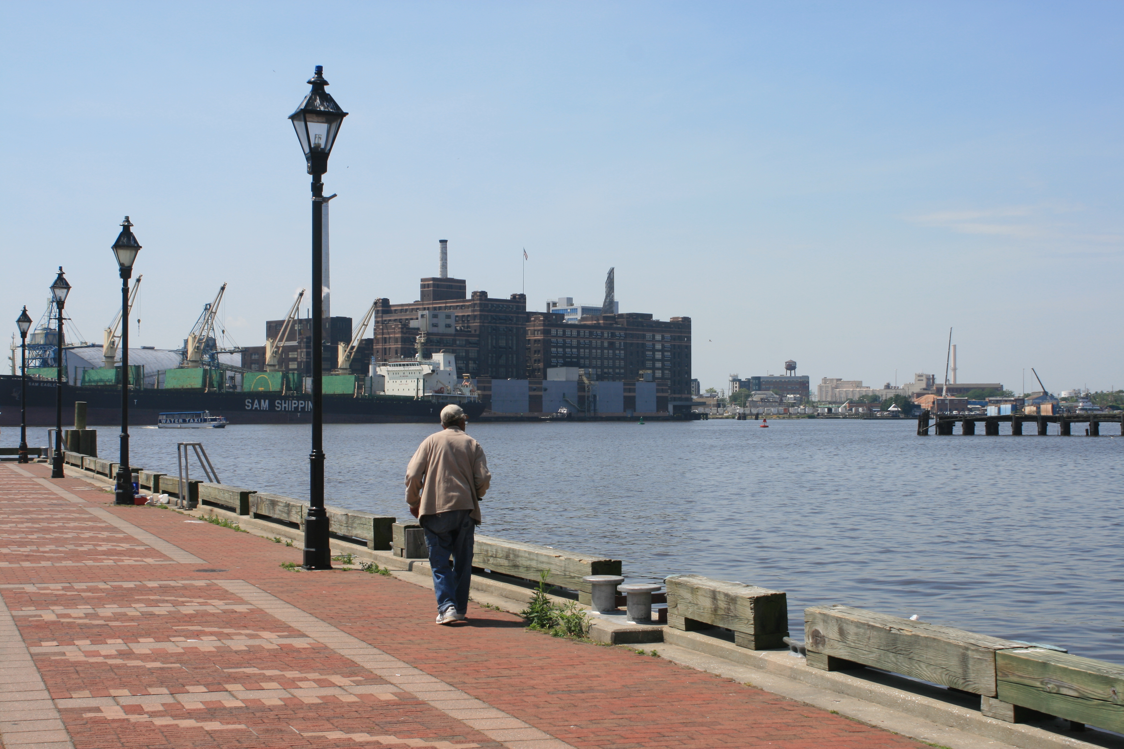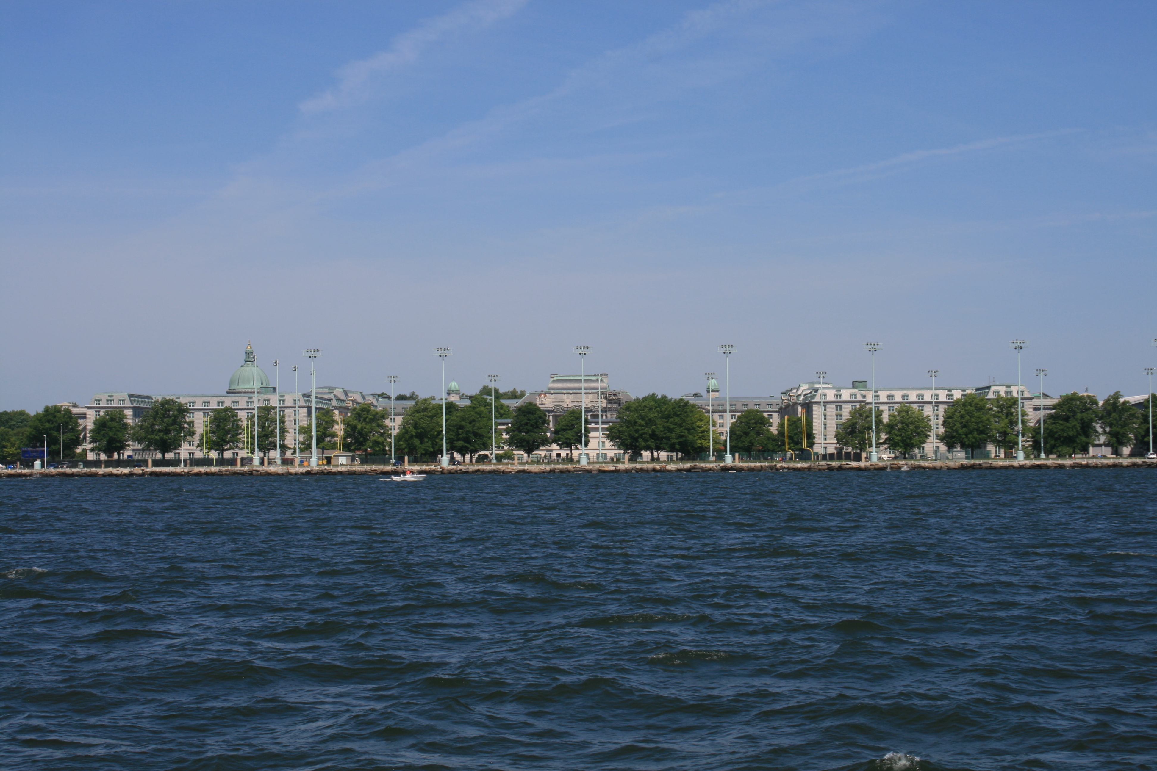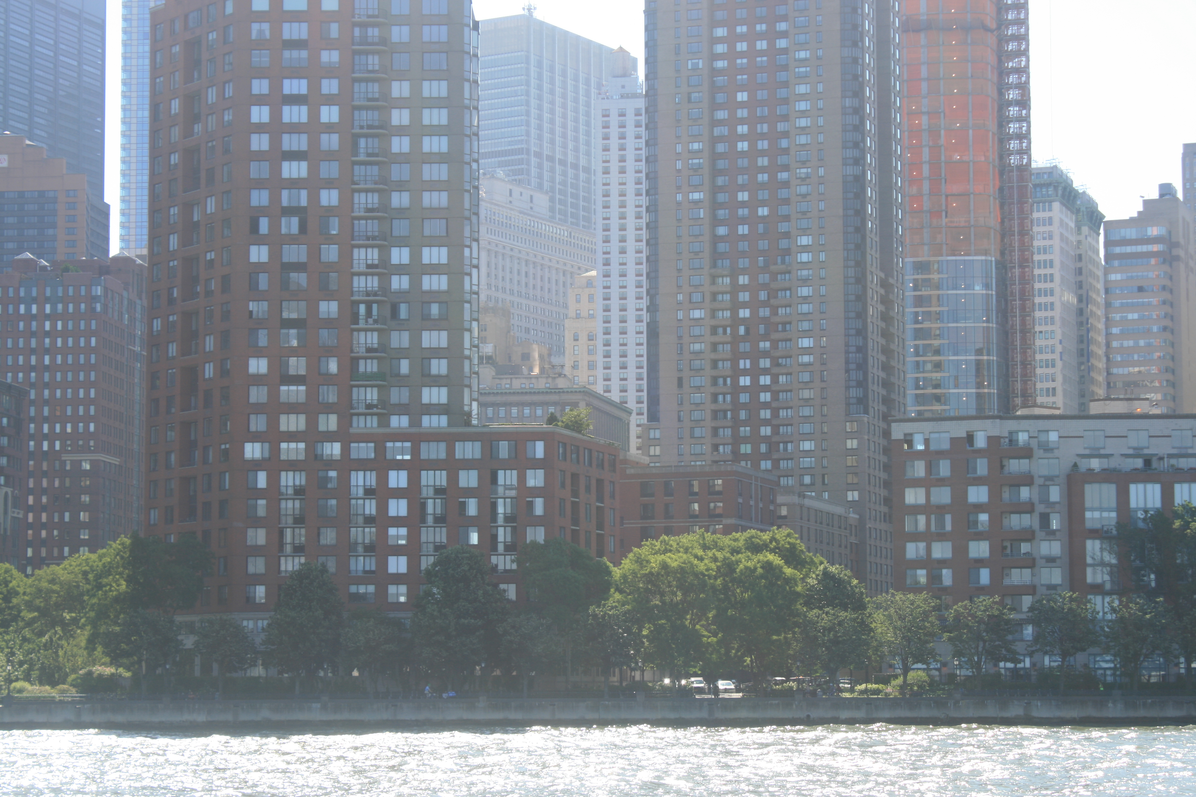 We weren’t sure whether the weather forecast had been wrong, or it was the local effects of the tides, the wakes caused by the many large and small ferry boats, and the wind funnelling round the tall buildings. But I had gone down from the bridge to take photographs from the foredeck, and found myself trapped there, hanging on to the anchor post, unable to get back up to the bridge, while Carina pitched and tossed her way past Battery Park.